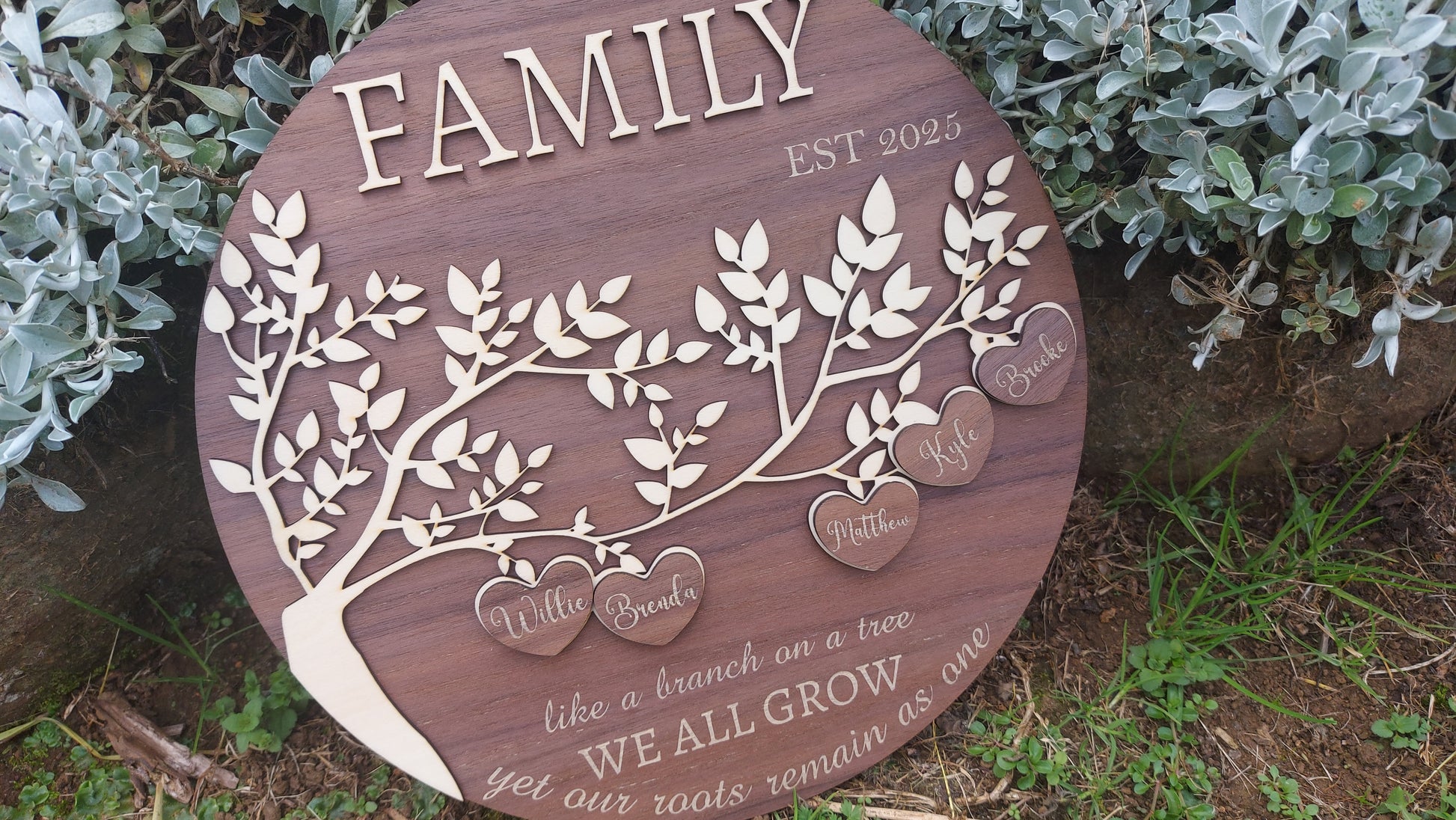 Our 3 Layered Personalised Wooden Family Tree signs are made using Walnut Ply, and Basswood to give this lovely 2 tone effect.
